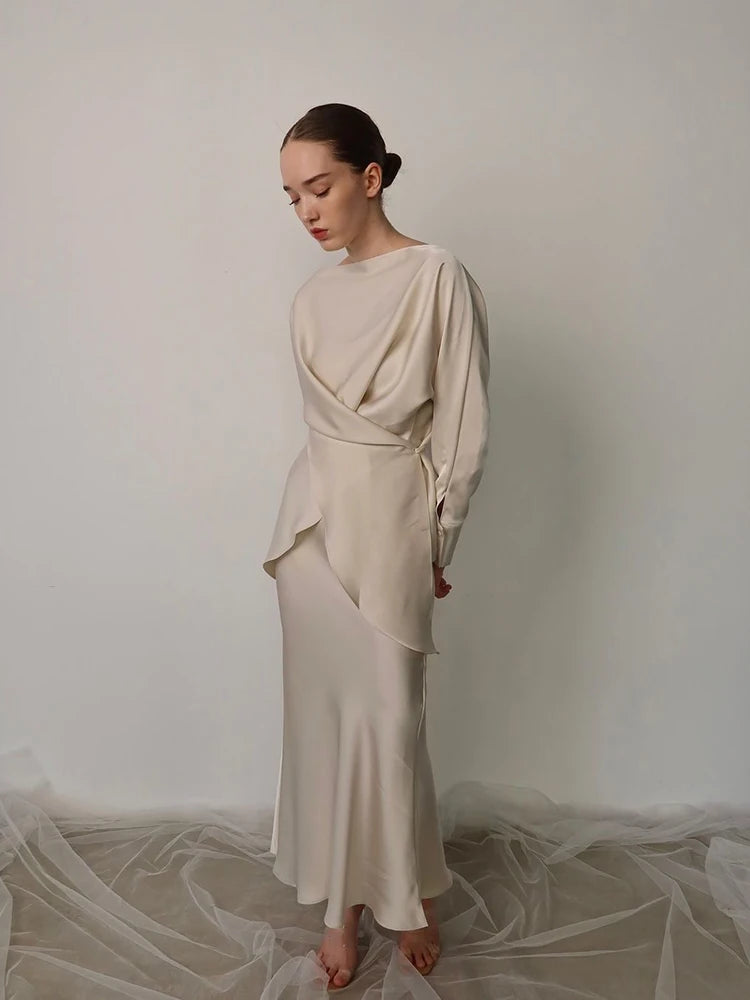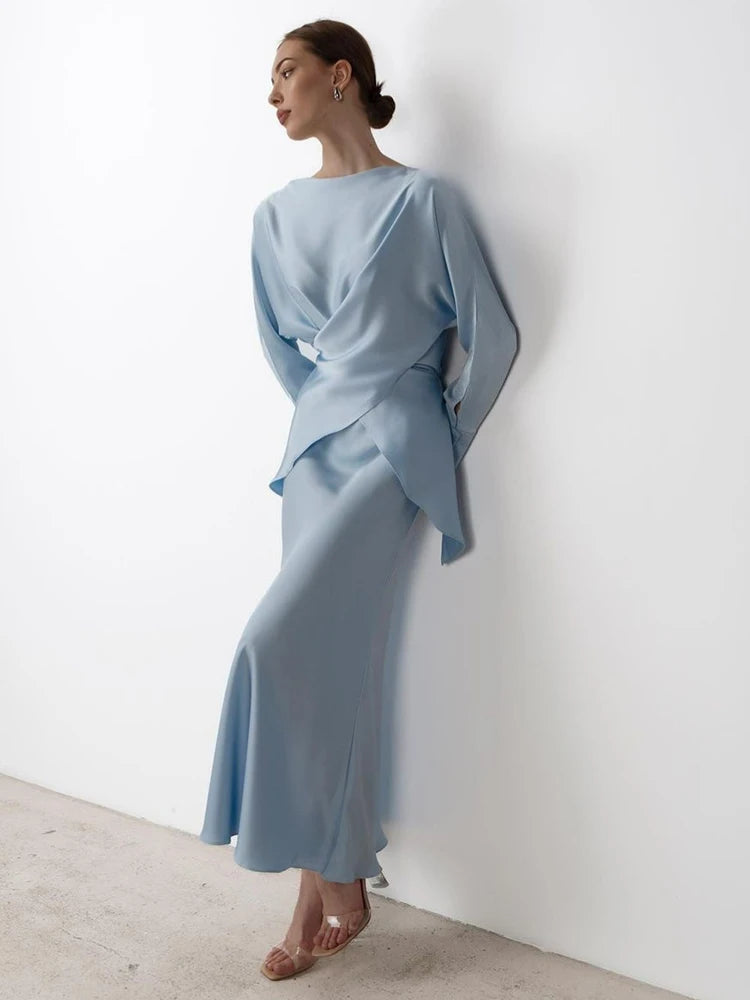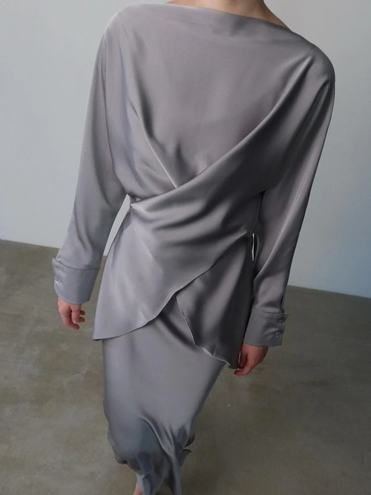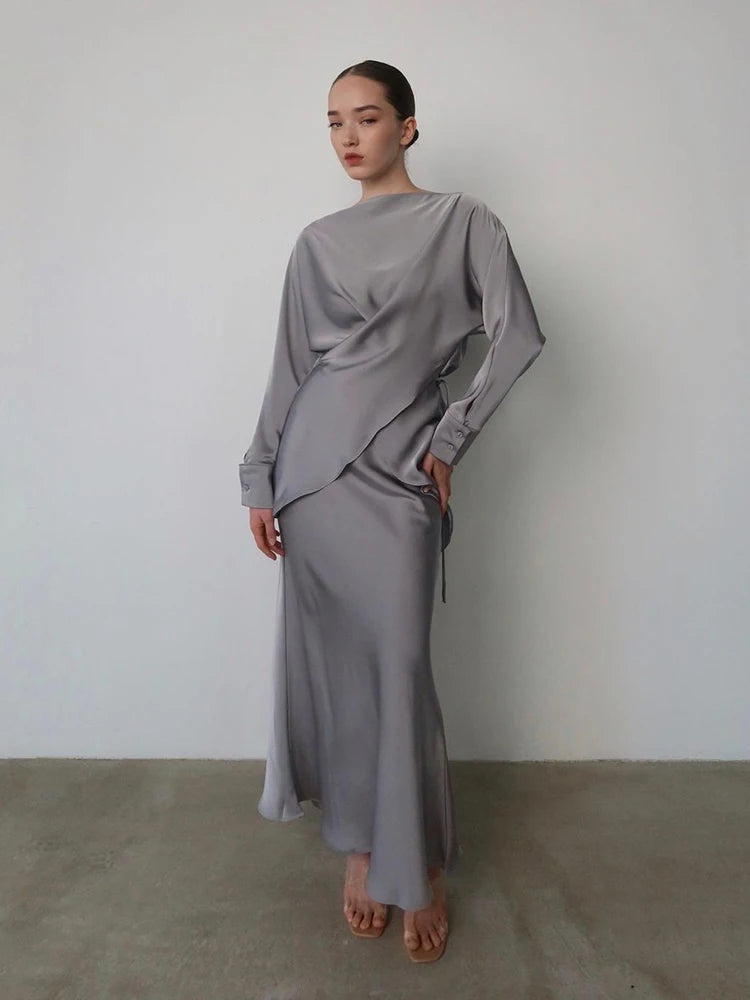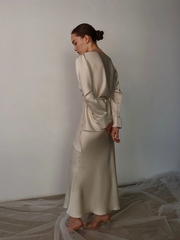 minus Spring Elegant Satins Outfit Women Long Sleeved Lace Up Top+High Waist Loose Straight Bust Skirt Autumn Female Two Piece Set