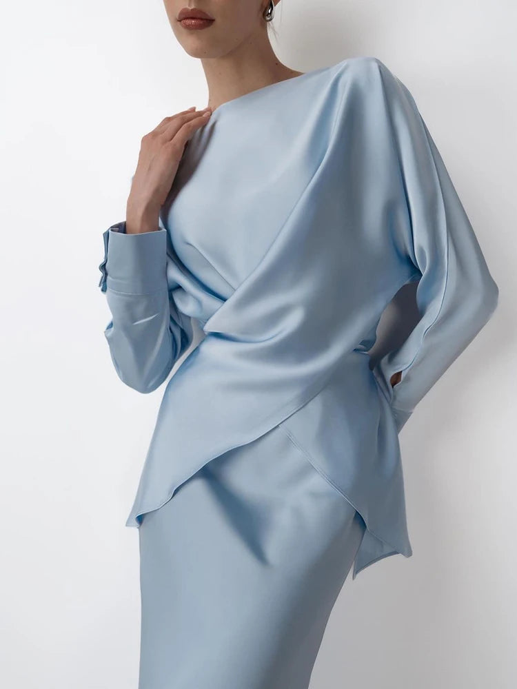 plus Spring Elegant Satins Outfit Women Long Sleeved Lace Up Top+High Waist Loose Straight Bust Skirt Autumn Female Two Piece Set