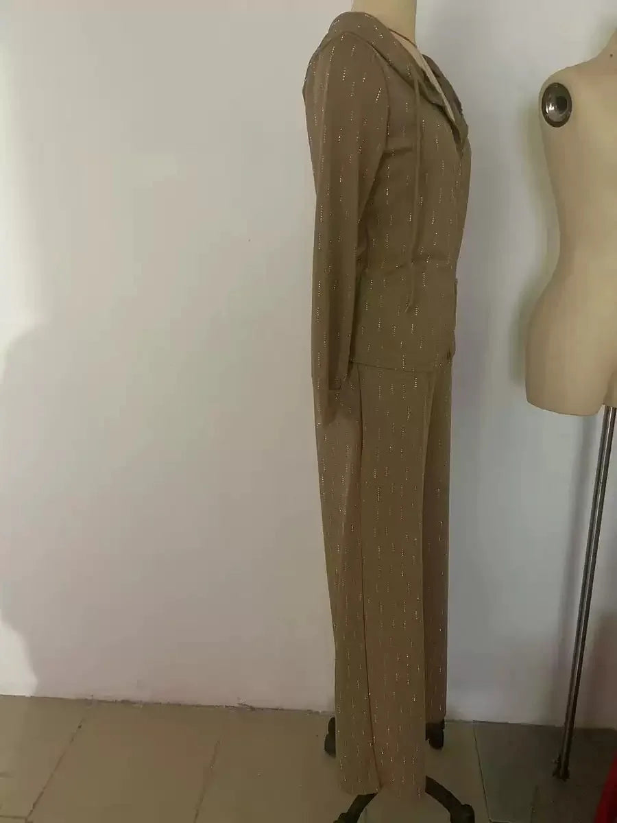 plus Spring Elegant Pantsuits Women Diamond Hooded Long Sleeved Zipper Jacket+High Waist Straight Wide Leg Pants Female Two Piece Set