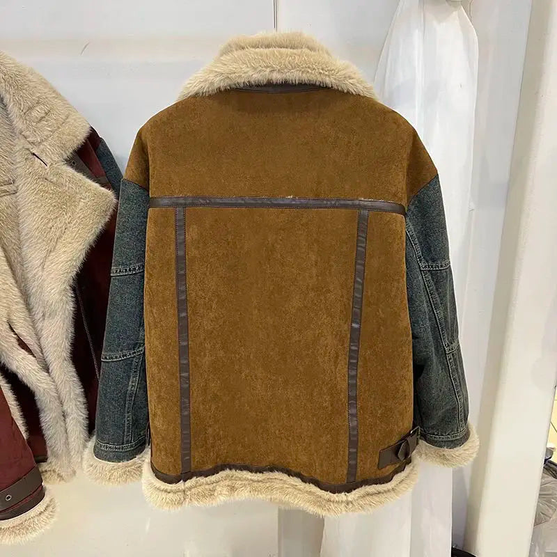 minus Winter Denim Splicing Big Lapel Warm Jackets Woman Single Breasted Long Sleeve Shearling Coat Lady Street Thicken Outerwear Coat